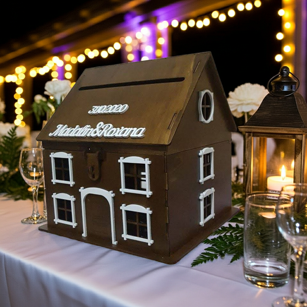 • Cutie de bani nunta personalizata.este realizata din lemn si finisata folosind lacuri profesionale pe baza de apa.