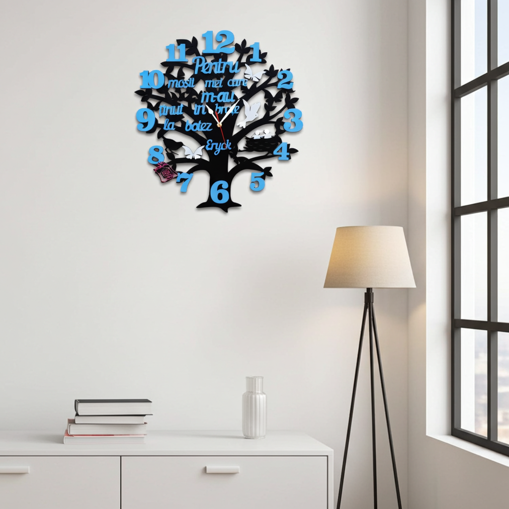cadou personalizat pentru nași, bunici sau părinți. Mesajul emoționant aflat în centrul coroanei copacului transformă fiecare privire spre ceas într-o amintire frumoasă a evenimentului special (botez, nuntă, aniversare).