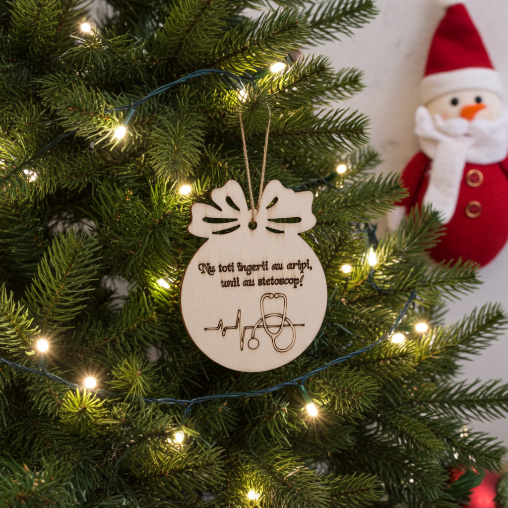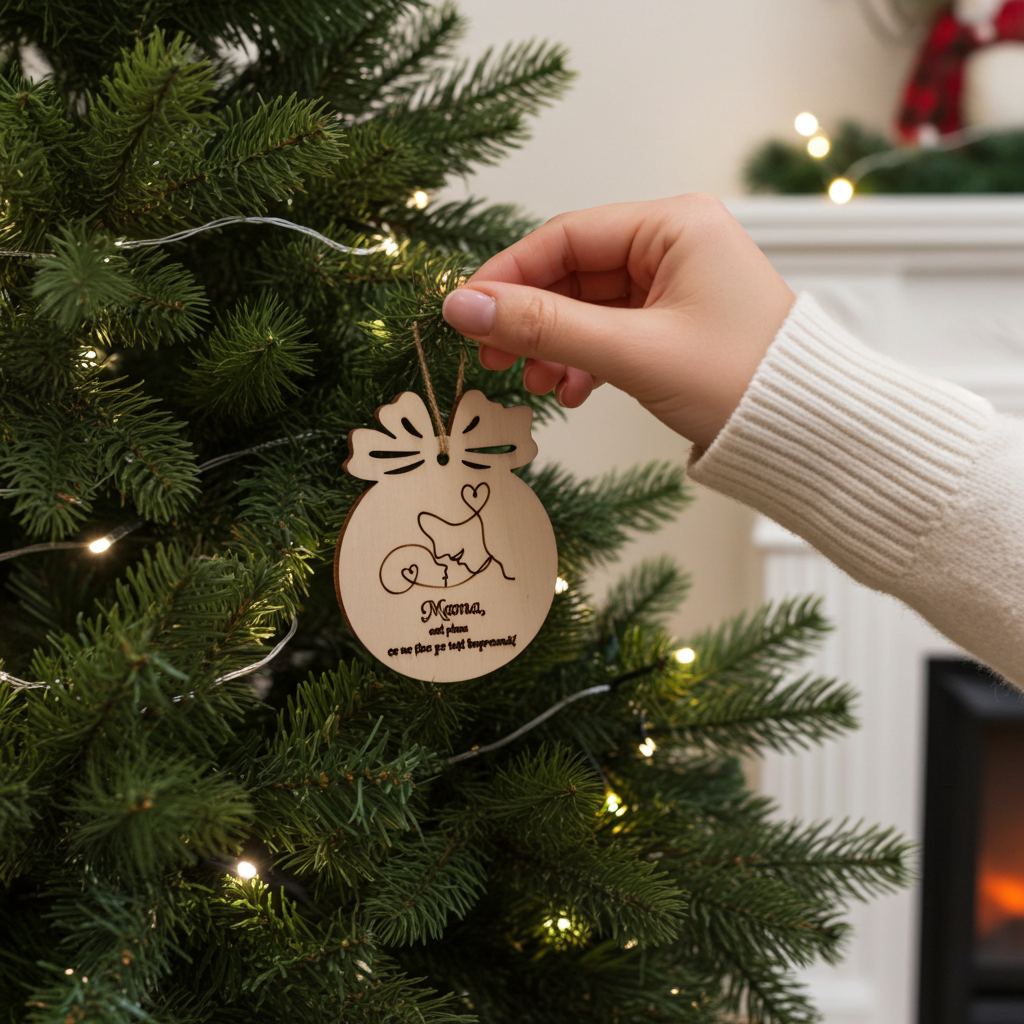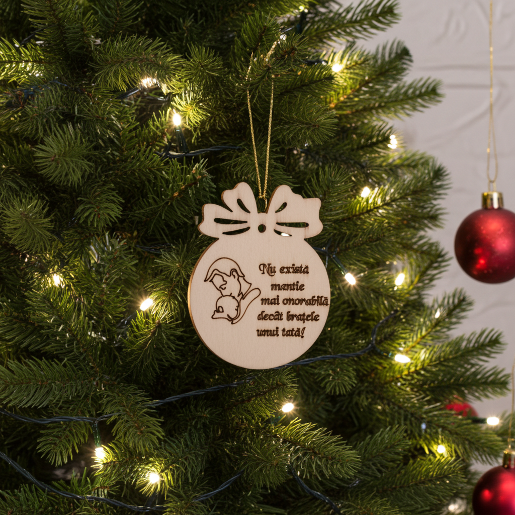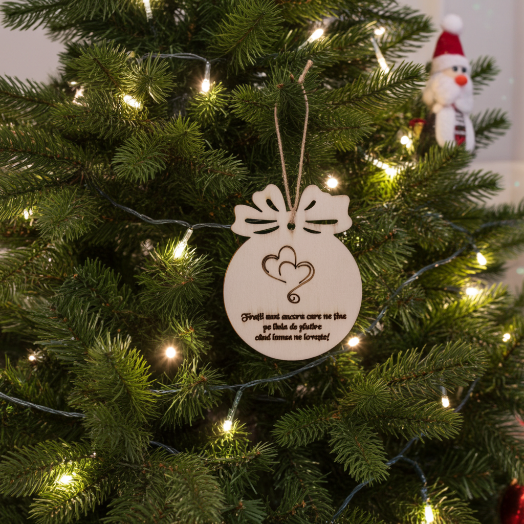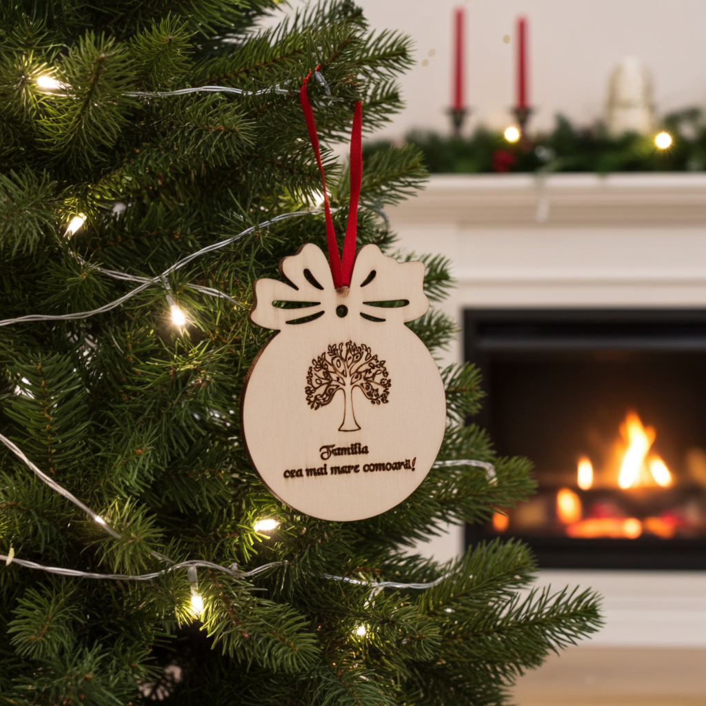 Creați amintiri de neuitat în acest Crăciun cu un Glob din Lemn Personalizat! Fiecare glob este gravat cu laser și poate fi inscripționat cu numele fiecărui membru din familie – de la 'Mami' și 'Tati', la 'Bunica' și 'Pisicuța',etc. Aceste ornamente de brad unice din lemn natural sunt cadoul perfect de Crăciun, transformând bradul într-o adevărată poveste a familiei tale.