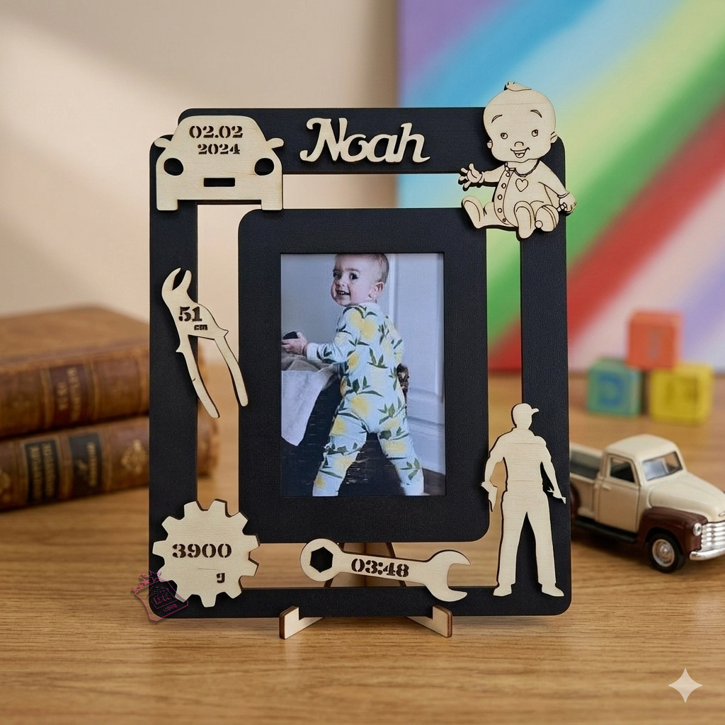 Păstrează amintirea primelor zile ale micuțului Noah într-o ramă foto unică, din lemn, personalizată cu elemente din meseria tatălui sau a mamei. Un cadou emoționant și de durată pentru proaspeții părinți sau decorațiune perfectă pentru camera copilului.
