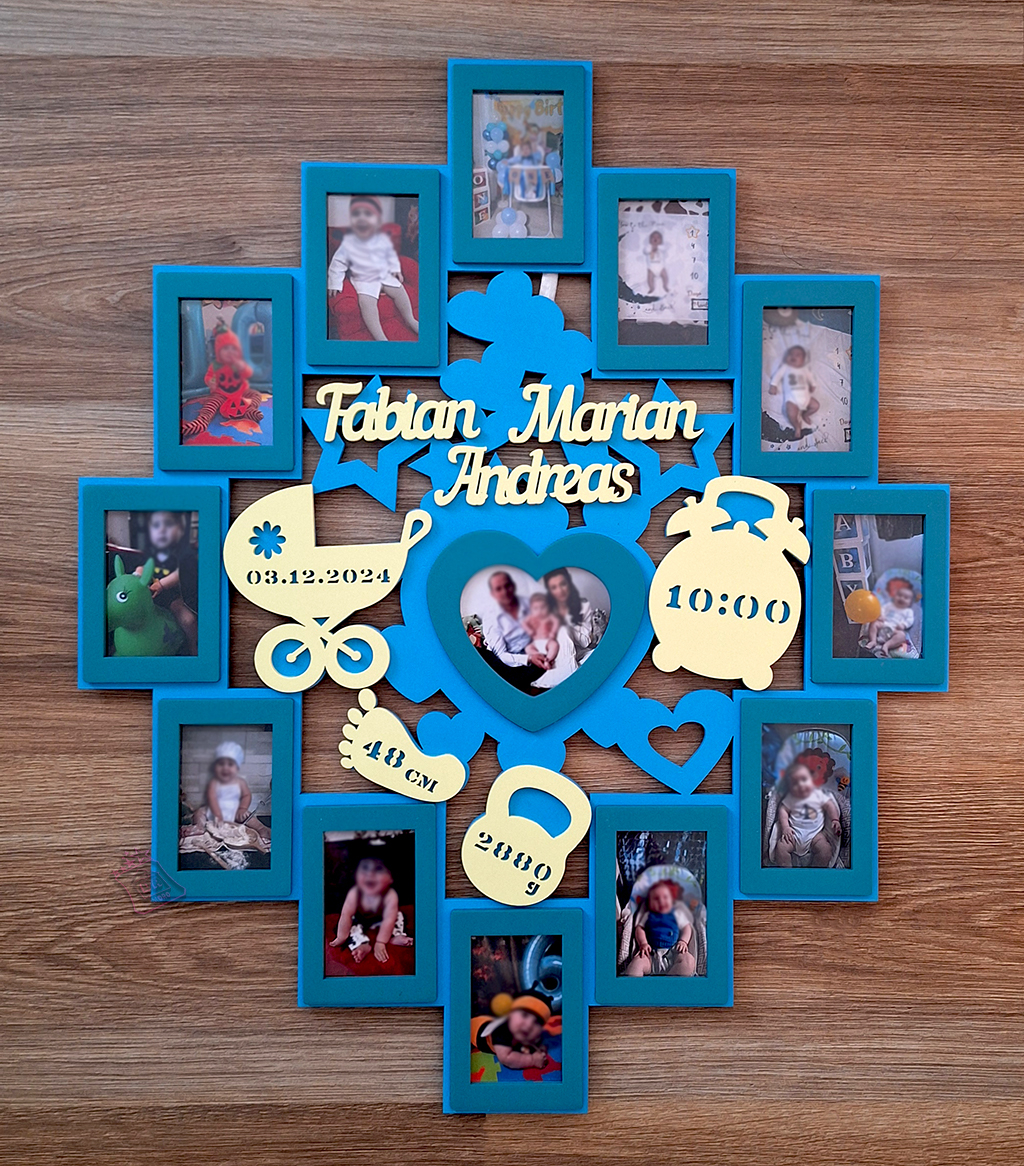 • Rama foto personalizata cu 12 poze, este realizat din lemn si finisat folosind lacuri profesionale pe baza de apa BABY FRIENDLY.