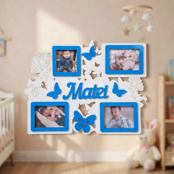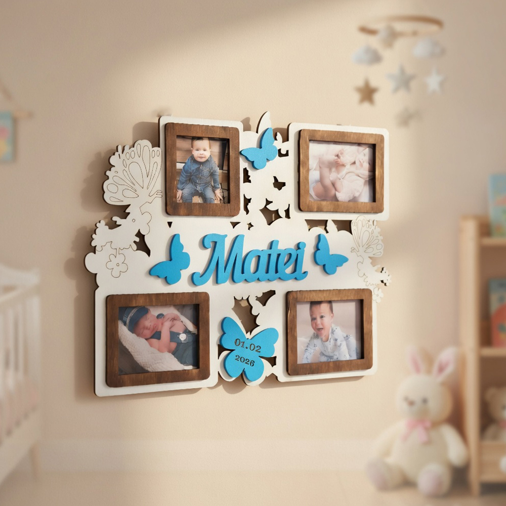 Rama foto personalizata fluturasi, este realizata din lemn si finisata folosind lacuri profesionale pe baza de apa BABY FRIENDLY.