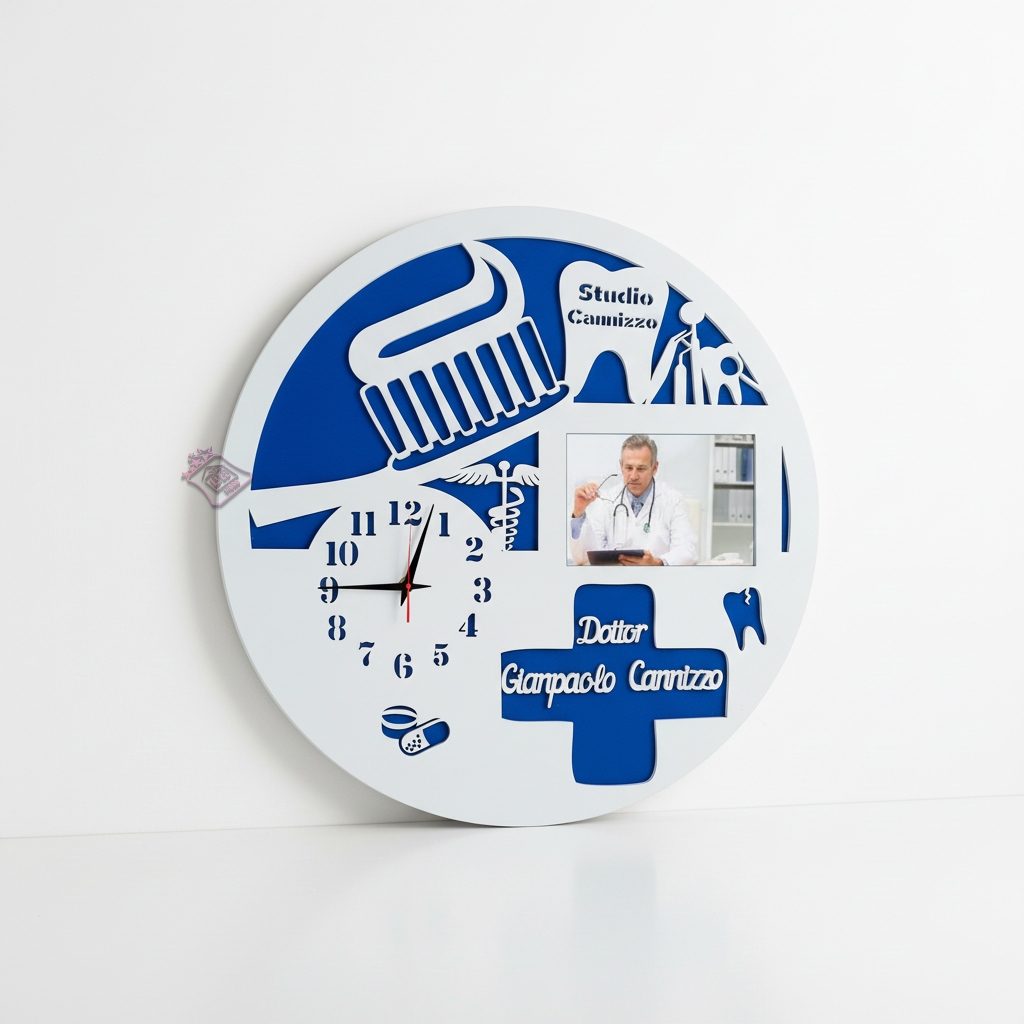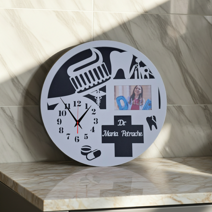 Ceas personalizat dentist, este realizat din lemn si finisat folosind lacuri profesionale pe baza de apa.