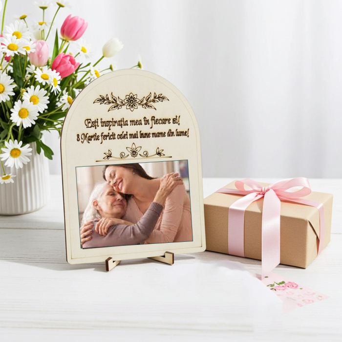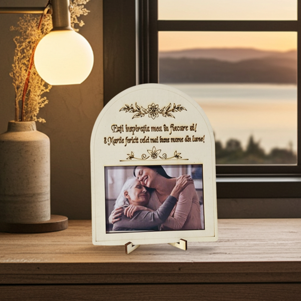 Această ramă foto din lemn, cu un design deosebit în formă de arcadă, este creată special pentru a celebra legătura unică dintre mamă și copil. Este un cadou care îmbină naturalețea lemnului cu emoția unui mesaj personalizat, fiind ideal pentru 8 Martie sau orice altă ocazie în care vrei să îi spui „Mulțumesc”.